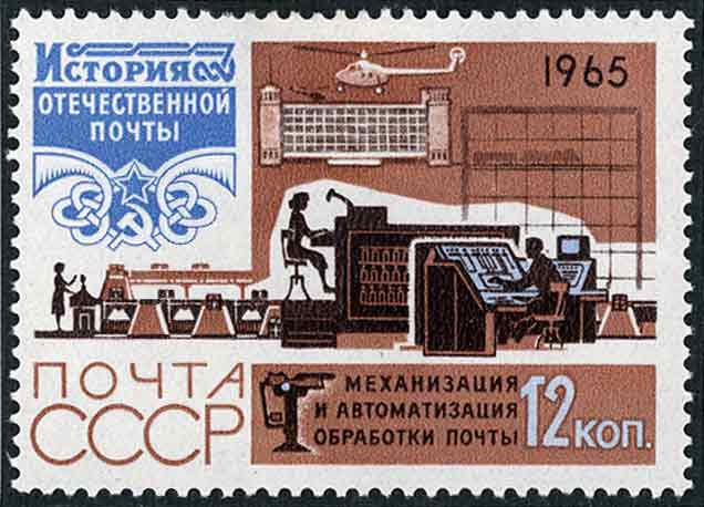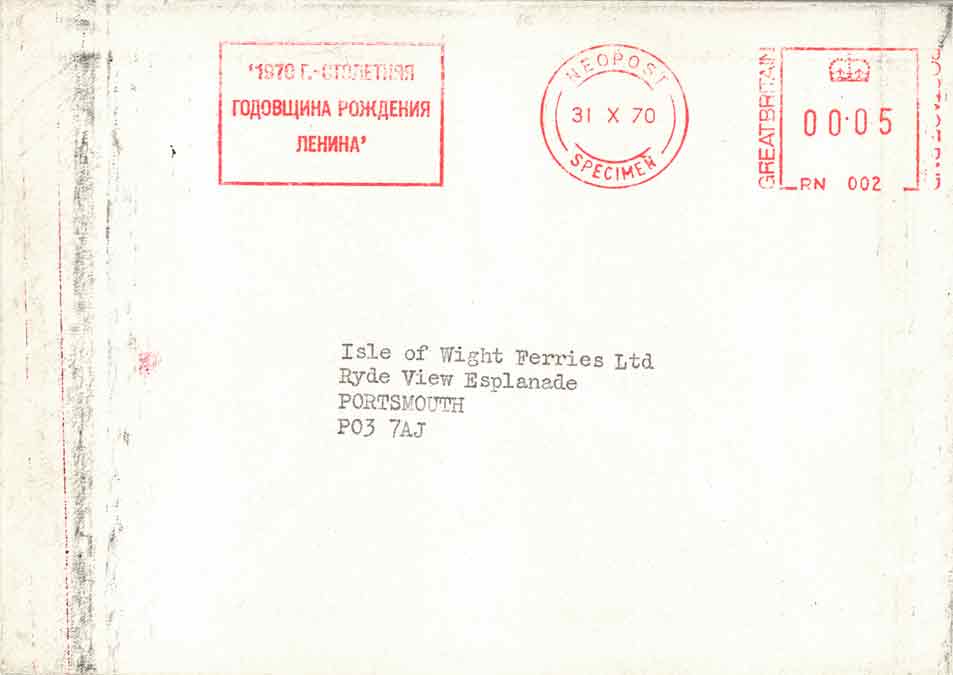 In 1960, two of the original Single Position Letter Sorting Machines (SPLSM) were purchased from Thrissell Engineering Co. Ltd. by the Soviet authorities. In 1970, twp SPLSMs of a later type were purchased from Masson Scott Thrissell, the successor company. The cover shown was used during the tests and has been through the machines a number of times. It has a red captial "R" ident on the back.