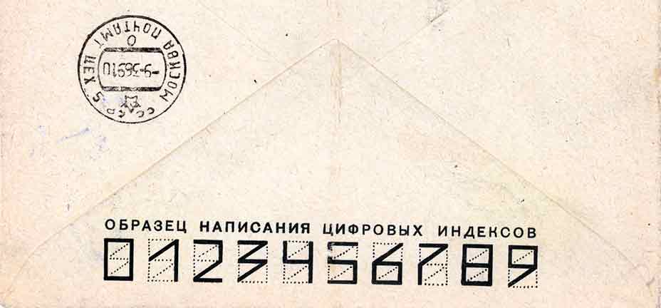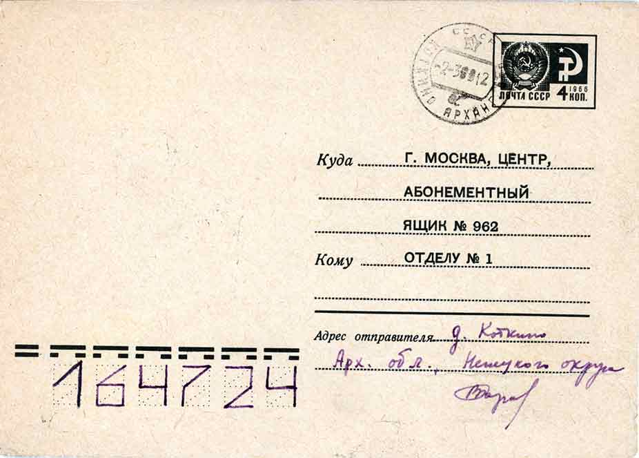 This cover is the only one of this type seen postally used. It was posted in Kotkino 2.3.1969 and back stamped in Moscow on the 9th. The address index is for Kotkino (Arkhangel'sk oblast'), not for the Moscow addressee.